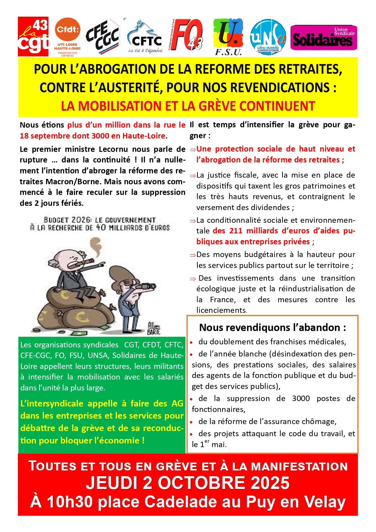 Le Puy en Velay : 10h30 place Cadelade [voir tract intersyndical de la Haute-Loire]