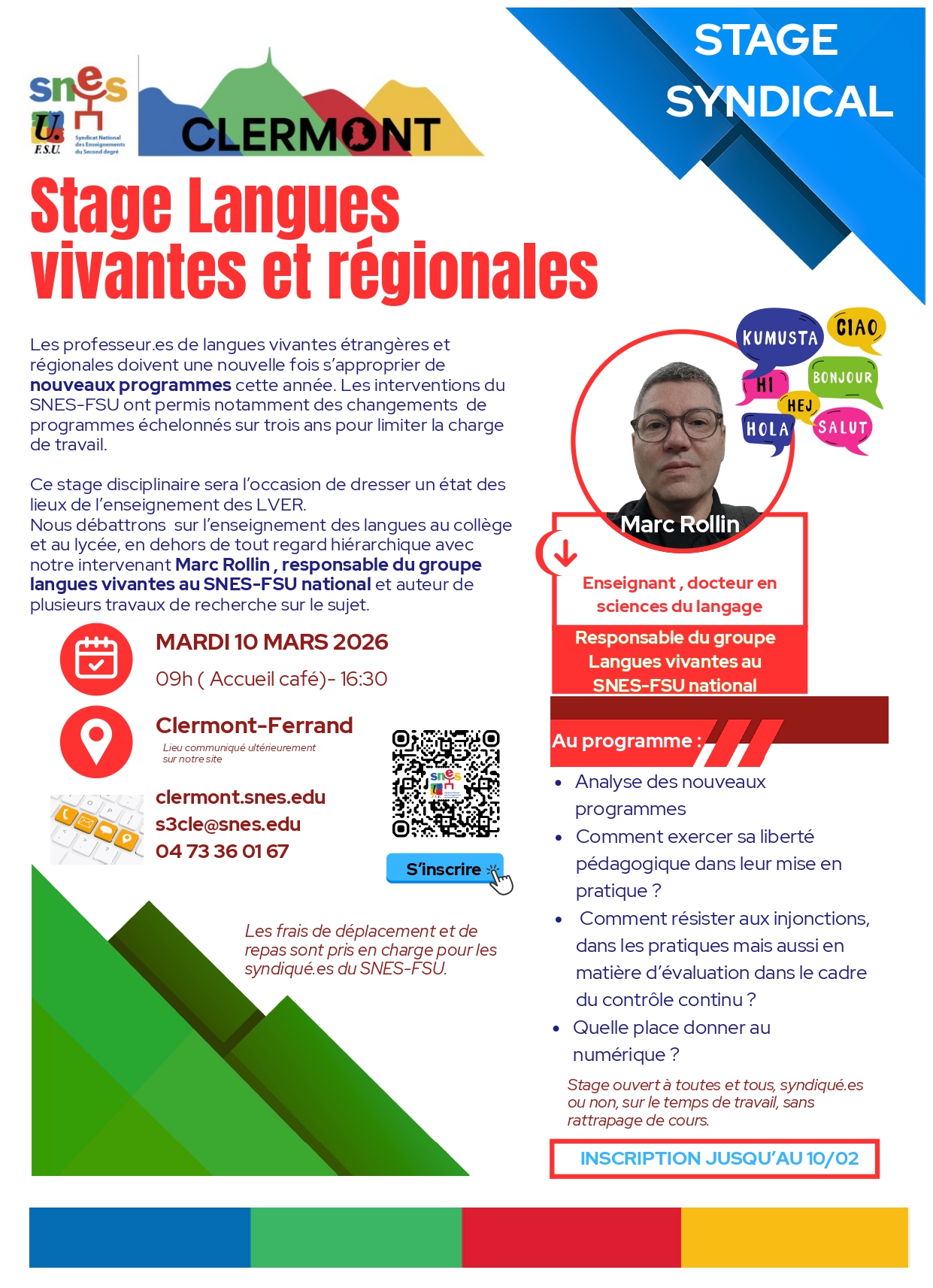 Ce stage de formation « langues vivantes », organisé par le SNES-FSU Clermont, est ouvert à toutes et à tous, syndiquées ou non, sur le temps de travail, sans rattrapage de cours. Les frais de déplacement et de repas sont pris en charge pour les syndiqué.es du SNES-FSU.