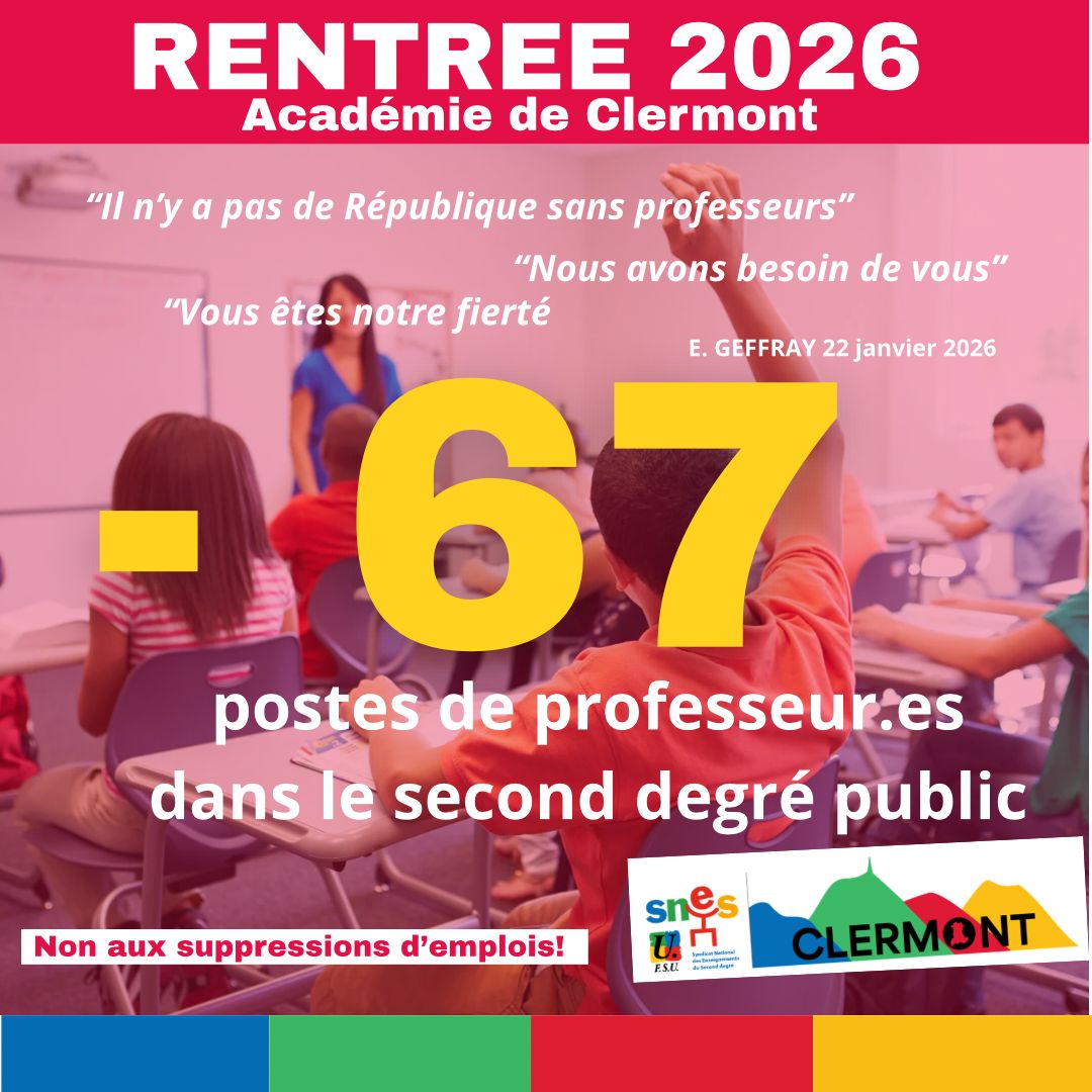Baisse de la dotation de 548,46 heures. De nombreux lycées subissent des pertes importantes, Madame de Staël à Montluçon (-77h) ; Banville à Moulins (-44h) ; Blaise de Vigenère à St Pourçain (-38h) ; Albert Londres à Cusset (-65,5h) ; C&A Dupuy au Puy (-76h) ; E. Chabrier Yssingeaux (-39h) ; E. Duclaux à Aurillac (-40,54h) ; J. Monnet à Aurillac (-23,87h) ; S. Apollinaire à Clermont (-80h) ; La Fayette à Clermont (-103h) ; Virlogeux à Riom (-78h) ; Montdory à Thiers (-81h) et Jean Zay à Thiers (-33h). Inquiétudes aussi sur le lycée Valéry Larbaud à Cusset !